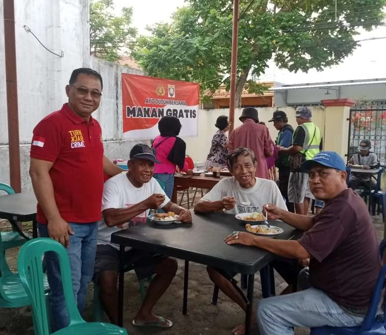 Mari ibu-ibu dan bapak-bapak, segera sarapan di sini dan di sana tersedia pemeriksaan kesehatan gratis. Jangan sampai melewatkan sarapan, agar nanti saat bekerja semangatnya bertambah,” kata Kombes Pol Pol Max Mariners sambil berbicara dengan masyarakat.
